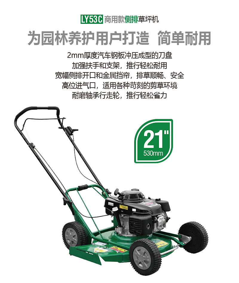 經典純側草坪機,是根據國內草坪修剪習慣,設計的一款性價比高的草坪修剪機,結構簡單耐用,寬大側排草開口配置金屬金屬擋簾,安全耐磨。